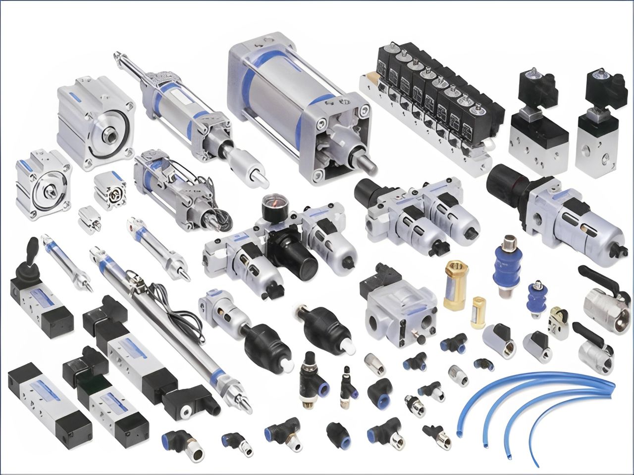 Phụ kiện và linh kiện kết nối: Ống dẫn khí, co nối nhanh, khớp nối, phụ kiện lắp đặt.